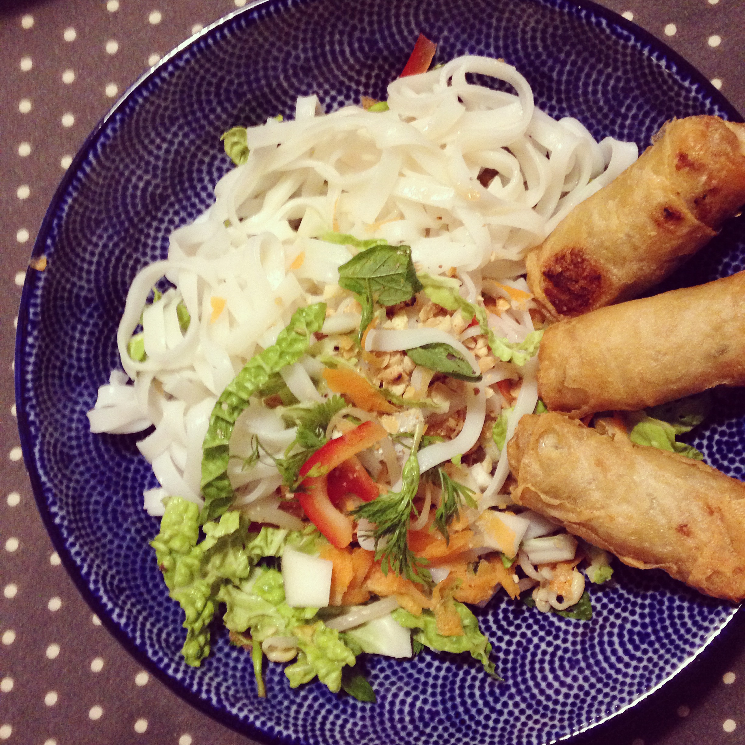 Répartir le mélange de crudités dans un bol. Ajouter les pâtes, les herbes fraîches ciselées puis les arachides concassées. Arroser avec une cuillère de sauce et déguster aussitôt avec des nems.