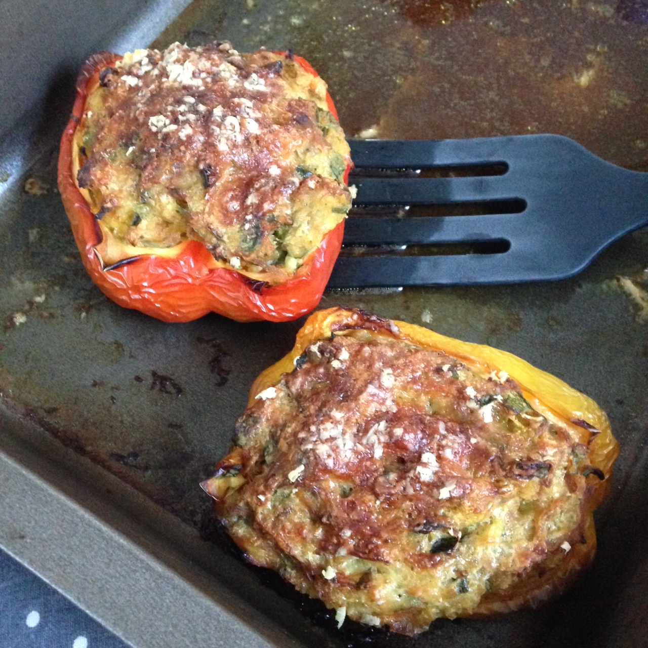 Ouvrir les poivrons en deux et les débarrasser des graines. S’ils tiennent debout je découpe un chapeau. Remplir avec la farce et parsemer de parmesan.
