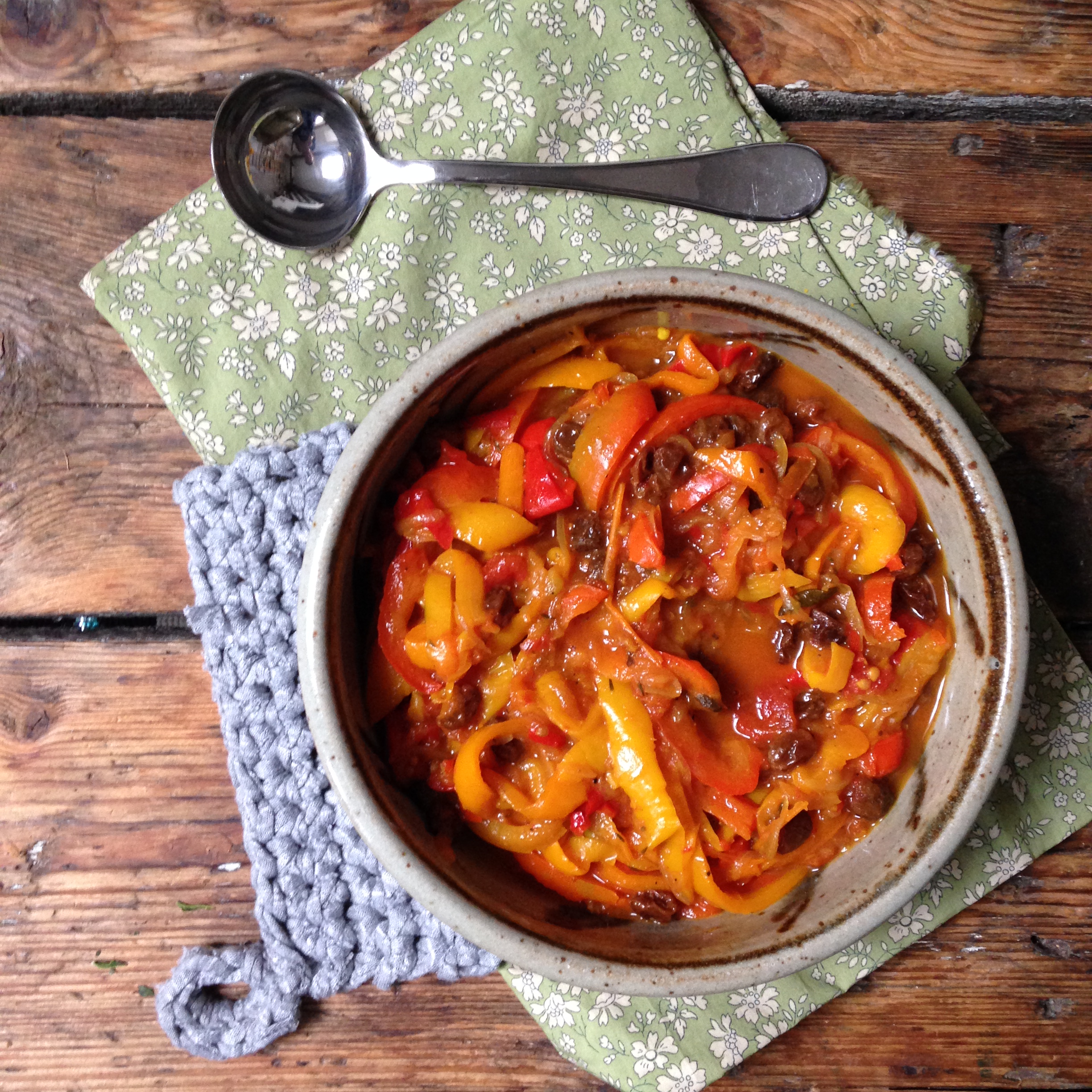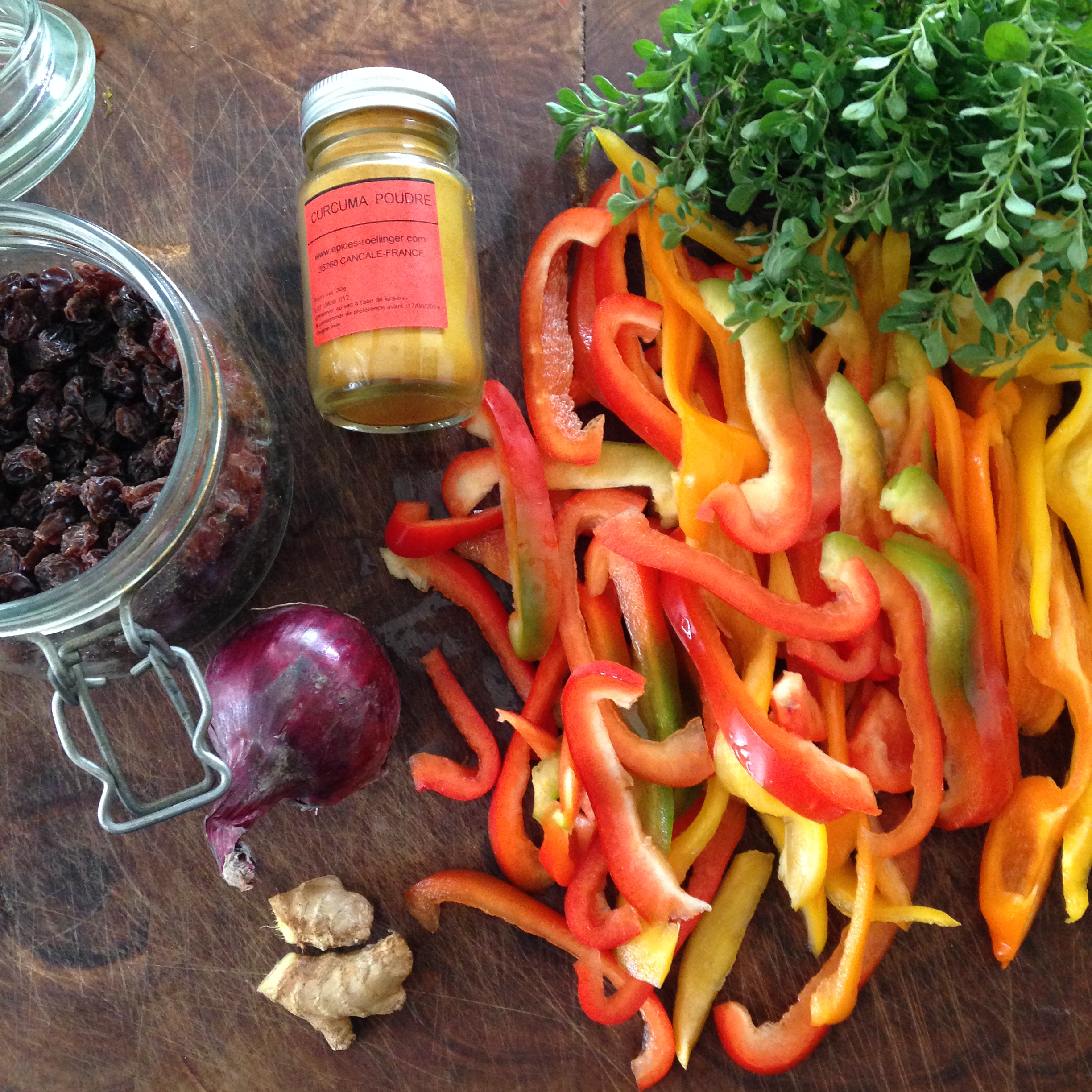 800 g de poivrons de toutes les couleurs, 1 gros oignon rouge, 2 tomates bien mûres, 2 poignées de raisin de Corinthe, 1 bouquet garni (sauge, thym, marjolaine), 1 noix de gingembre, 1 bouquet de coriandre, 1 c. à soupe d’huile d’olive, 1/2 c. à café de piment d’Espelette, 1 c. à café de curcuma, sel, poivre.